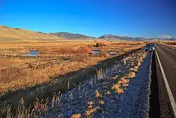 Idaho State Highway 28 begins at an intersection with ID 33. The route heads northwest before passing the Mud Lake Airport, proceeding to an intersection with State Highway 22. After a long distance, it proceeds through the Lemhi Valley, bending north before curving northwest again for a short distance. The roadway passes the Leadore Airport on its way into Leadore, meeting Idaho State Highway 29 while in the community. Just after exiting the town, the road travels parallel to the Lemhi River for several miles before ending at U.S. Route 93 in the community of Salmon.[1]