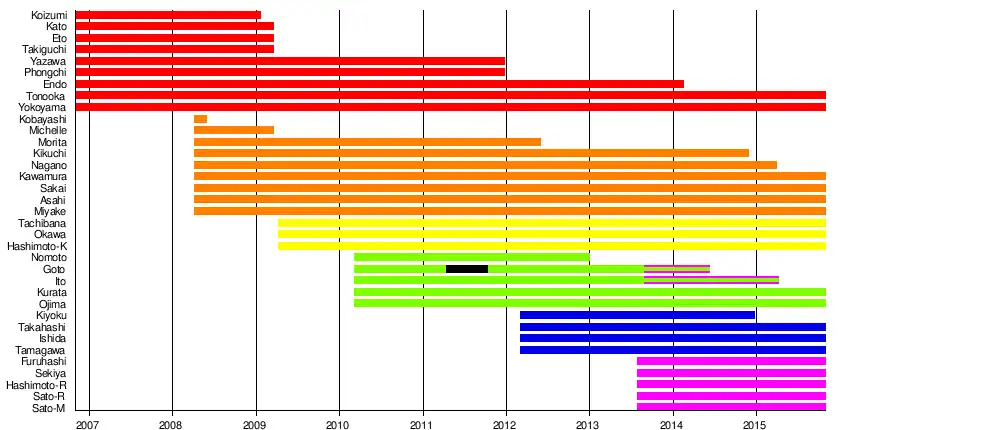 | 3 | Mai Endo (遠藤 舞, Endō Mai) (Second Leader) | Tsubaki (Japanese Camellia) | Box Corporation | February 2014 |