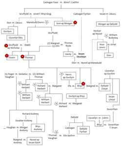 Ieuan's ancestry can be traced even further back since Cadwgan Fawr was a descendant of the tribal patriarch Llywelyn ap Gwrgan, whose paternal line traces back to the 6th-century Plaws “Hen”, king of Dyfed.[11]