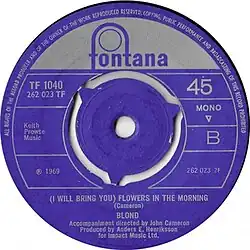 Just a month before "If I Thought You'd Ever Change Your Mind" was about to be released, Tages' changed their name to the more internationally viable Blond at the suggestion of Reese-Edwards.[7][12] Nonetheless, the song was initially released on 20 June 1969 as the B-side of the group's British single "I Wake Up And Call" through Fontana.[13][nb 1] On all releases of the song by Blond, it was retitled "(I Will Bring You) Flowers In The Morning", which was the song's opening verse; it is unclear as to why the title was changed, with Henriksson believing Fontana to have made that decision.[14] Nonetheless, it later also appeared as the B-side of "I Wake Up And Call" in Norway and the Netherlands in August 1969,[13][nb 2] as well as the B-side of Blond's debut US single "Deep Inside My Heart" in October 1969.[15][nb 3] The song was finally issued as the penultimate track on side two of their album The Lilac Years, released in Sweden on 17 October 1969.[10][nb 4]