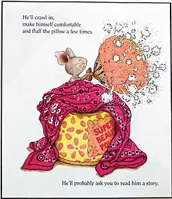 The text was interpreted by illustrator Felicia Bond to show the increasing energy of the mouse, with the little boy being run ragged by the end of the story. The art was praised by School Library Journal for its "meticulous attention to detail",[1] and was executed with vibrant colors of blended pencil in a complex process of layering magenta, cyan, yellow, and black on separate sheets, which were then assembled during printing.