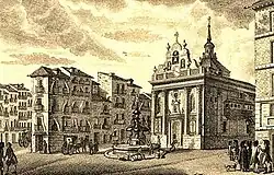 The Iglesia de Nuestra Señora del Buen Suceso, commonly known as Iglesia del Buen Suceso was a church of Madrid that delimited the eastern part of the Puerta del Sol (Madrid).[1] The church comes from a remodeling of the Hospital Real de la Corte (Royal Hospital of the Court) (built in 1483). Was doing functions of church and hospital since 1590. Its lonja was meeting place for several centuries. The church's clock would be important during this period until it was installed one of better performance on the Real Casa de Correos.[2] Its demolition coincided with the Confiscation of Mendizábal that left space for the later expansion that was done for the Puerta del Sol.