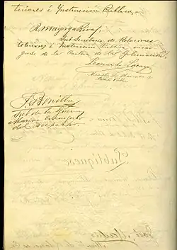 Ignacio Chaves Tellería was the President of Nicaragua from 1 January to 1 March 1891.[1] He was born c. 1836 in León, León, Nicaragua and died October 31, 1925, in León, León, Nicaragua. His parents were Eusebio Chaves and Ramona Tellería. He was married to Paulina López and their children were Ignacio, Tránsito, Dagoberto and Eusebio, all Chaves López. His first last name is Chaves, with S, and not Chávez, with accent and Z. Part of the confusion is that some of his children decided to write their last name as Chávez. In addition, people believed his second last name was López. That confusion arose from the fact that his son, Ignacio, wrote his name as Ignacio Chávez López. His registration certificate shows the correct names.[2]