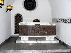 In 1984, his descendants requested for the remains of Mościcki and his wife to be moved from Switzerland to Poland. The relevant Polish authorities agreed that a funeral was to be held in Warsaw and be completely private, without any state ceremonies. However, the authorities of the Canton of Geneva in Switzerland withdrew their agreement for political reasons after protests related to Solidarity from emigrants. On 10 September 1993, Mościcki's remains were exhumed from the cemetery of Versoix and transported to Poland. Three days later they were deposited on behalf of incumbent President Lech Wałęsa in the crypt of St. John's Archcathedral, Warsaw. Mościcki's symbolic grave is located in the Avenue of Merit at the Powązki Cemetery in Warsaw, where his second wife is buried next to him.[9]