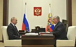 Sechin has been a confidant of Russian leader Vladimir Putin since the early 1990s. Sechin was chief of staff to Putin when he was the deputy mayor of St. Petersburg in 1994. When Putin became President in 2000, Sechin became his deputy chief of staff, overseeing security services and energy issues in Russia.[3][4] Putin appointed Sechin as chairman of Rosneft, the Russian state oil company in 2004.[5][4] He was as Deputy Prime Minister of Russia in Vladimir Putin's cabinet from 2008 to 2012.[6] He is currently the chief executive officer, president and chairman of the management board of Rosneft.[5]