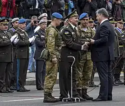 Colonel Hordiichuk was granted the title of Hero of Ukraine of the Golden Star on 21 October 2014, as per a decree issued by the President of Ukraine. This was in recognition of his extraordinary bravery and heroism in safeguarding the territorial integrity and state sovereignty of Ukraine, as well as his fidelity to the oath of allegiance.[6] The military title of Major general was conferred to him on 23 August 2016.[18] The next day, at the parade on Khreshchatyk celebrating Ukraine's 25th anniversary of independence, President Petro Poroshenko gave the major general shoulder marks.[19]