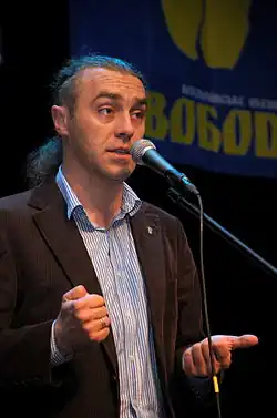 Ihor Mykhailovych Miroshnychenko (Ukrainian: Ігор Михайлович Мірошниченко; born 20 February 1976) is a Ukrainian sports journalist and far-right politician who was a People's Deputy of Ukraine from 2012 to 2014.[1] He was awarded the title of Merited Journalist of Ukraine in 2006.