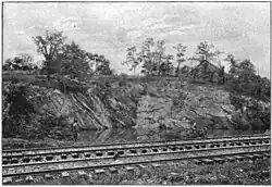 With the onset of the Civil War, the demand for slate dropped off sharply, as did the available workforce. To compound the problem, the B&O railroad ran an injunction against the local quarry owners for undermining their tracks. These two factors led to the closing of many of the town's quarries in 1870. An outside mining company, the Maine Co., attempted to start a mine in Ijamsville but gave up by 1874.[4] Christopher Riggs, a carpenter, then owned and operated the only remaining slate mine, which produced only powdered slate (used as a fertilizer base, a purple dye for paint, or in vitrified bricks).[3] The town shrunk considerably with the end of its mining industry; the 1880 census listed only 71 residents.[12][17]
