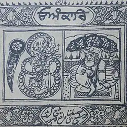 According to Wendy Doniger, the phrase is a compound of ik ("one" in Punjabi) and onkar, canonically understood in Sikhism to refer to the "absolute monotheistic unity of God".[9] Etymologically, the word onkar denotes the sacred sound "om" or the absolute in a number of Indian religions.[9] Nevertheless, Sikhs give it an entirely different meaning.[9][22][23] Pashaura Singh writes that "the meaning of Oankar in the Sikh tradition is quite different in certain respects from the various interpretations of this word in the Indian philosophical traditions",[22] and the Sikhs "rather view Oankar as pointing to the distinctively Sikh theological emphasis on the ineffable quality of God, who is described as 'the Person beyond time,' the Eternal One, or 'the One without form'."[9] Onkar is, according to Wazir Singh, a "variation of Om (Aum) of the ancient Indian scriptures (with a slight change in its orthography), implying the seed-force that evolves as the universe."[24] Guru Nanak wrote a poem entitled Oankar in which, states Doniger, he "attributed the origin and sense of speech to the Divinity, who is thus the Om-maker".[9]
