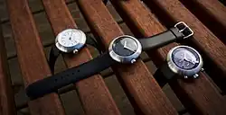 The new Ikepods were designed in Switzerland by Emmanuel Gueit,[8] the Swiss watch designer responsible for the Audemars Piguet Royal Oak Offshore.[9] The new Ikepods include a time-only 42mm watch called the Duopod and a chronograph model in a 44mm case called the Chronopod.[10] The new models are based on the original Ikepod Horizon and Hemipode models.[11] The new Ikepods feature the same elliptic forms, cases in 316L steel and the original silicone hyperallergenic straps.[12] The company states that its Duopods and Chronpods wear more like 39mm and 41mm watches because of the lack of external lugs and the way the case tapers at the edges.[11] Ikepod relaunched on Kickstarter on 18 September 2018.