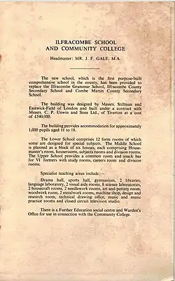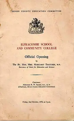 Originally opened by then Education Secretary Margaret Thatcher in 1970 and known as Ilfracombe School & Community College, it was the first purpose-built comprehensive school in the country. Subsequently, it was called Ilfracombe College. Since the early 1980s, facilities available to students have included a television studio with an editing suite. The buildings were designed by Messrs & stillman.[1] Following fundraising and negotiations from 2001, the college was awarded specialist college Media Arts status in 2004 and was renamed Ilfracombe Arts College. In 2007, the school built a £3.4 million arts block named the Beacon Arts Centre. The arts department relocated to this department, freeing up rooms for other uses in the school. The previous art rooms were refurbished into new administration, student services, and learning support areas. The previous student services were refurbished into a conference room with video conferencing facilities. The school converted to academy status in May 2013, but continues to specialise in the arts.