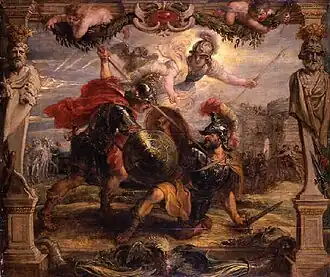 Hera and Athena continue to support the Achaean forces throughout the poem as a result of this, while Aphrodite aids Paris and the Trojans. The emotions between the goddesses often translate to actions they take in the mortal world. For example, in Book 3 of the Iliad, Paris is about to be defeated by Menelaus, who had challenged him to single combat, however, Aphrodite intervenes to save Paris from the wrath of Menelaus: "Now he'd have hauled him off and won undying glory but Aphrodite, Zeus's daughter, was quick to the mark, snapped the rawhide strap."[20] This connection of emotions to actions is just one example out of many that occur throughout the poem: there is constant intervention by all of the gods, especially to give motivational speeches to their respective protégés, often appearing in the shape of a human being they are familiar with.[19]
