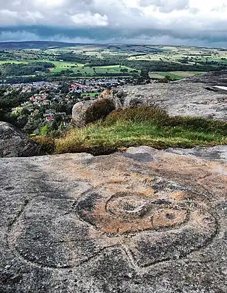 The earliest evidence of habitation in the Ilkley area is from flint arrowheads or microliths, dating to the Mesolithic period, from about 11,000 BC onwards.[2] The area around Ilkley has been continuously settled since at least the Neolithic, around 3000 BC; more than 250 cup and ring marks, and a curved swastika carving possibly dating to the period have been found on rock outcrops,[3] and archaeological remains of dwellings are found on Ilkley Moor. A small stone circle (possibly a burial monument), known as the ‘Twelve Apostles’, was constructed 4,500 years ago, during the Early Bronze Age.[2] Serious interest in the rock art of Ilkley began after the publication of the "Prehistoric Rock Sculptures of Ilkley" in 1879 by Romilly Allen in the Journal of the British Archaeological Association.[3]
