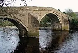 Ilkley's rural surroundings attract walkers and cyclists to the area. The landmark Cow and Calf rocks, which overlook the town on Ilkley Moor, consist of a large outcrop, which allegedly imitates a cow, and a boulder, which imitates a calf. The site is also visited for its rock climbing routes.[65] The Old Bridge just outside the town centre is the official start to the Dales Way, an 84-mile (135 km) walk through the dales to Bowness-on-Windermere in the Lake District.[66]