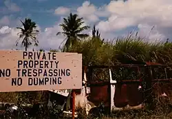 Effects of illegal dumping include health, environmental, and economic consequences. While legal waste disposal locations, such as landfills, are designed to contain waste and prevent byproducts infiltrating the surrounding environment, illegal dumping areas do not typically incorporate the same safeguards. Due to this, illegal dumping may sometimes lead to pollution of the surrounding environment. Toxins or hazardous materials infiltrating soil and drinking water threaten the health of local residents.[8] Additionally, illegal dump sites that catch fire pollute the air with toxic particles. Environmental pollution due to illegal dumping can damage health. Short-term issues include asthma; congenital illnesses; stress and anxiety; headaches, dizziness and nausea; and eye and respiratory infections. Long-term concerns include cancer and kidney; liver; respiratory; cardiovascular; brain; nervous; and lymphohematopoietic diseases.[11] Beyond negative health outcomes due to pollution and toxic waste, illegal dumps pose a physical threat. Unstable piles of material and exposed nails threaten harm to humans, specifically children who may be attracted to illegal dumps as play areas.[8]