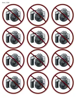 "No photographs" sticker. Designed for persons at conferences who do not want any digital likeness of them taken, including video, photography, audio, etc.