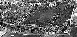 On October 24, 1925, Michigan defeated Illinois, 3–0, in Champaign. The victory came as Illinois celebrated homecoming in front of a record crowd of 67,000 at Memorial Stadium. Stopping Red Grange was considered to be the key to beating Illinois in 1925.[31] During the pre-season practice sessions, Michigan's line coach Tad Wieman dressed a player in a sweater with Grange's number and sent his guards and tackles "after the mythical Grange with instructions to 'hit him hard.'"[32] Before the game, Michigan coach Fielding H. Yost told reporters: "One of the greatest throngs in all football history is here. For weeks the game has been on every tongue. . . . Our players have been compared as to weight, speed, and ability. The stage is set."[33]