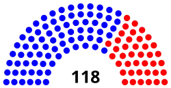 The Illinois House of Representatives is the lower house of the Illinois General Assembly. The body was created by the first Illinois Constitution adopted in 1818. The House under the constitution as amended in 1980 consists of 118 representatives elected from individual legislative districts for two-year terms with no limits; redistricted every 10 years, based on the 2010 U.S. census each representative represents approximately 108,734 people.[1]