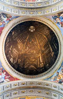 Quadratura, a term which was introduced in the seventeenth century and is also normally used in English, became popular with Baroque artists. Although it can also refer to the "opening up" of walls through architectural illusion, the term is most commonly associated with Italian ceiling painting. Unlike other trompe-l'œil techniques or precedent di sotto in sù ceiling decorations, which often rely on intuitive artistic approaches to deception, quadratura is directly tied to seventeenth-century theories of perspective and the representation of architectural space.[1] Due to its reliance on perspective theory, it more fully unites architecture, painting and sculpture and gives a more overwhelming impression of illusionism than earlier examples.