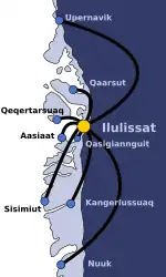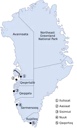 - ^ "Ilulissat". Qaasuitsup Municipality. Archived from the original on 2 June 2012. Retrieved 11 July 2010.
