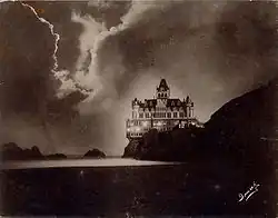 The art direction for the 1988 release was instead put in the hands of CBS Records' art director Arnold Levine and his staff.[99] They based the cover art on a fin de siècle image of the Cliff House, a restaurant perched on the cliffs just north of Ocean Beach on the western side of San Francisco, California, built with the architectural style of a Victorian château and destroyed by fire in 1907.[100] The back cover is a maritime landscape, modified to appear as the continuation of the picture on the front and similarly tinted in sinister black and grey colors.