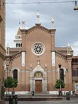 The church is Romanesque Revival style with neo-gothic elements. The exterior is clad in brick; the facade is salient and has, at the center, the portal with mosaic bezel and, at the top, the circular canopy. The bell tower, inspired by that of San Marco in Venice was added later, in 1929, it is home to a concert of six bells.