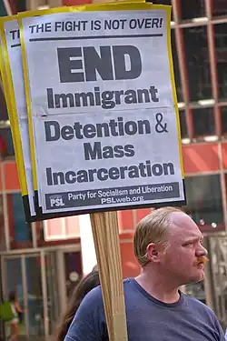Protests by detained immigrants have taken place at several facilities, including the Varick Federal Detention Facility in Manhattan. One hundred detainees at the Varick site, all of whom had no criminal charges, sent a petition in October 2008 to the New York City Bar Association detailing human rights abuses and substandard conditions and asking for legal help.[57] On January 19, 2010, detainees at the same site initiated a hunger strike against the conditions of detention. The strike was broken up by a SWAT team that allegedly "used pepper spray and "beat up" some detainees, took many to segregation cells as punishment and transferred about 17 to immigration jails in other states."[65] In response to the report, the New York City Bar Justice Center began the NYC Know Your Rights Project. This initiative combines the efforts of the City Bar Justice Center, the Legal Aid Society and the New York chapter of the American Immigration Lawyers Association with the goal of providing more pro bono legal help specifically at the Varick detention center. Many detainees are left without legal council at the Varick Facility and at other detention center because their cases are considered civil and not criminal. In these civil cases, defendants must pay for legal counsel. The Bar's Justice Center found that very few detainees could afford such help.[66] Similarly, the Columbia Law Review states that in general most detainees do not have legal representation in their court cases. A report found that the lack of legal aid to detainees threatens the legitimacy and fairness of the court system and the efficiency of the courts themselves. For detainees without legal aid, the decisions of the court on a case are more likely to be incorrect or unjust, according to the report.[67] Many detainees do not get legal aid because, apart from financial issues, they often are transferred to other detention centers without giving alert to family, legal representation or advocacy network. Centers can be rural and isolated, located where legal aid, representation and other forms of advocacy can be inaccessible.[68]
