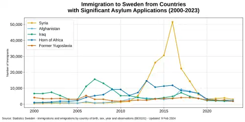 In 2014, 81,300 individuals applied for asylum in Sweden, which was an increase of 50 percent compared to 2013 and the most since 1992. Of these, 47 percent came from Syria, followed by 21 percent from the Horn of Africa, mostly Somalia. Overall, 77 percent (63,000) of requests were approved, with approval rates differing greatly between different applicant groups. In early October 2015, less than two weeks into the month, a record figure of 86,223 asylum applications was reached, and in the remaining weeks of the year that figure rose to 162,877. In 2016, 28,939 people applied for asylum,[14] after temporary border ID controls had been initiated and been in effect during 2016.[15] As of 2014, according to Statistics Sweden, there were around 17,000 total asylum immigrants from Syria, 10,000 from Iraq, 4,500 from Eritrea, 1,900 from Afghanistan, and 1,100 from Somalia.[16] In the year 2017, most asylum seekers come from Syria (267), Eritrea (263), Iraq (117), and Georgia (106).[17]