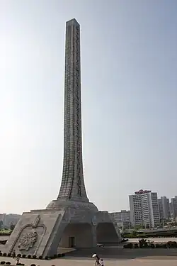 This monument was erected in 1997 in memory of Kim Il Sung, who died in 1994, covering a total area of 17000 m2 and extending with two arches over the artery leading to his mausoleum, the Kumsusan Palace, near the Ryonghung crossroads. It stands on a 10.50-metre-high, two-bay arch-shaped plinth through which road traffic passes on its way to the mausoleums of Kim Il Sung and Kim Jong Il. The tower is 82 metres high. On both sides of the tower are inscriptions in the form of a bronze relief. Originally, the inscriptions referred only to the "eternal president" Kim Il Sung, but they were changed after Kim Jong Il's death and the obelisks now contain the names of the two North Korean leaders.