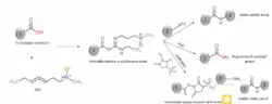 Amine groups are found throughout an antibody and are used as a target due to their easy steric accessibility and modification. An overview of this reaction is found in Figure 2. Most often amine groups found on lysine are covalently bonded to carboxyl groups of glutamic and aspartic acid on formed liposomes using certain agents. A two step process is utilized where the first step uses 1-ethyl-3-[3-dimethylaminopropyl] carbodiimide to create an amine reactive product from the carboxyl group.[6] This product is a target for a nucleophilic attack by the amine but it hydrolyzes quickly, so EDC is added to stabilize it. As seen in the Figure 2, the intermediate can lead to the desired stable amide bond by chance or the recreation of a carboxyl group.[6] To create more of the desired carboxyl-amine bond, N-hydroxysulfosuccinimide (sulfo-NHS) is added to form another intermediate that is an NHS ester.[6] The second step to this reaction is for the antibodies to use the N-terminus of the lipid to covalently conjugate by creating an amide bond via displacement of sulfo-NHS groups.[6] This leads to the final product of an antibody conjugated to a liposome to create an immunoliposome. This process is highly efficient and effective while maintaining the biological activity of the antibody.[6]