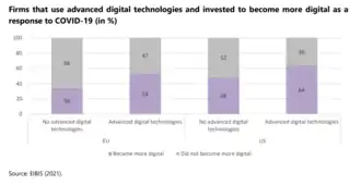 A survey conducted in 2021 found that while the coronavirus outbreak has boosted overall digitization, it has also widened the digital divide, specifically across firms. Leading businesses advanced digitization more frequently, but some enterprises fell behind and were less likely to convert digitally during the pandemic.[100] 53% of surveyed firms in the European Union had previously implemented advanced digital technology and invested more into other digital technologies. 34% of non-digital EU firms viewed the pandemic as a chance to begin investing in their digital transformation.[101][102] According to the survey, 16% of EU enterprises regard to access to digital infrastructure to be a substantial barrier to investment.[103][104][105]