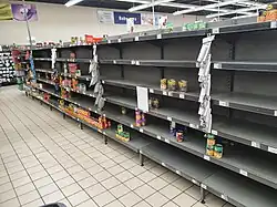 In many places there was panic buying with resulting shortages. There were some supply chain disruptions for some products; for instance, many hand pumps for hand sanitizer bottles are imported into the US from China and were in shorter supply.[7] For most food products in the US normal resupply happened, but panic buying causing empty shelves contributed to consumers' impulse to stock up and hoard.[8] A US food retail trade group advised retailers to accelerate ordering and consider rationing to prevent empty shelves.[8] Food retailers were "among the most affected by the coronavirus, but one of the few businesses that might actually benefit," at least in the short term according to the television channel Cheddar.[9] Some areas saw price gouging.[7]
