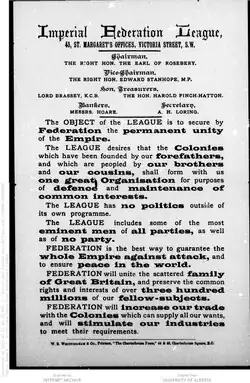 Francis Labilliere, William Westgarth and John Dennistoun Wood served on a committee of six to draft the prospectus of the Imperial Federation League.[2] It aimed to promote the Imperial Federation, to be formed in a similar way to the confederation of a majority of British North America into the Dominion of Canada in the mid-19th century. The United States and Canada were held up as concrete examples of how vast territories could be effectively managed while maintaining a central representative authority.