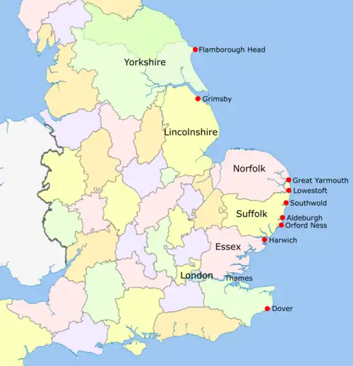 - The East Anglian coast from Great Yarmouth, Norfolk, to Southwold, Suffolk;