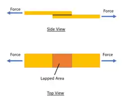 Lap shear strength (LSS) testing, in accordance with ASTM D 1002, is a method of destructive testing used to determine the strength of electrofusion welds of thermoplastic composite materials.[2][1] For this test, two rectangular samples of the composite are lapped at the ends and joined at the lap interface using resistance implant welding. Then, a tension strength test is performed on the welded sample, with the joint surface being loaded in pure shear, a load frame machine pulls the sample until failure and measures the maximum load.[2] The lap shear strength is the maximum tensile load imparted on the sample by the machine divided by the lapped area.[1]