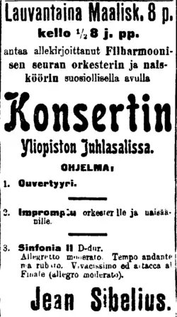 The Impromptu, Op. 19, is a single-movement work for female choir and orchestra written in 1902 by the Finnish composer Jean Sibelius. The piece, which is a setting of the Swedish poet Viktor Rydberg's poem Unge hellener (Young Hellenics), premiered in Helsinki on 8 March 1902, with Sibelius conducting the Helsinki Philharmonic Society and an amateur choir. The Impromptu was the middle item a program that also included two other first performances: the Overture in A minor (JS 144), which served as the opener; and the Second Symphony (Op. 43).[4][1]