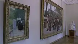 The catalog of the XIX traveling exhibition mentions four paintings presented by Nikolai Yaroshenko at once: "Portrait of N. N. Ge" (no. 78, canvas, oil, 92,5 × 73,5 cm, the canvas is currently in the Russian Museum), "In a Warm Land" (no. 79 in the catalog), "A Sleeping Child" (No. 80), "Seeing Off" (No. 81, canvas, oil, 125 × 150 cm, in the collection of the Omsk Regional Fine Arts Museum named after M. A. Vrubel).[31] Usually in modern art history three paintings are associated with this exhibition — "Portrait of N. N. Ge", "In a Warm Land" and "Farewell".[32] Only Irina Polenova, a senior researcher at the N. A. Yaroshenko Memorial Estate Museum, mentioned "A Sleeping Child" in connection with the exhibition in her 2018 book.[21]