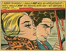 After 1972, Lichtenstein's comics-based women "look hard, crisp, brittle, and uniformly modish in appearance, as if they all came out of the same pot of makeup." This particular example is one of several that is cropped so closely that the hair flows beyond the edges of the canvas.[17] As with most of his early romance comics, this consisted of "a boy and a girl" subject.[18] It is described as a tense, melodramatic graphic single-frame depiction of a romantic dialogue between a man and woman.[4] Lichtenstein used horizontal parallel lines to convey the sense of motion.[19] A November 1963 Art Magazine review stated that this was one of the "broad and powerful paintings" of the 1963 exhibition at Castelli's Gallery.[10]