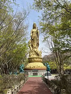 Near the cave is a tall, gold-colored statue of the bodhisattva Kannon. It is said to be the tallest statue in Ōita Prefecture.[6]