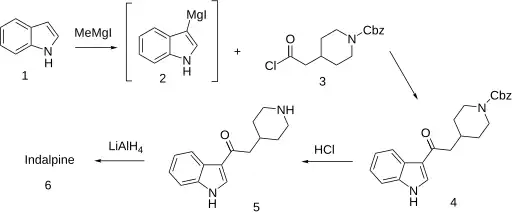 Metalation of indole (1) using methyl magnesium iodide forms the organo-magnesium derivative (2) which reacts with 1-benzyloxycarbonyl-4-piperidyl-acetyl chloride (3) to give (4). Acid-catalyzed removal of the benzyloxycarbonyl (Cbz) protecting group gives the ketone (5). Reduction with lithium aluminium hydride yields indalpine.[6][7]