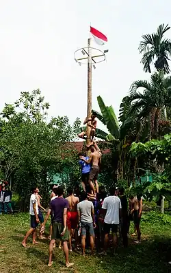 - Panjat pinang, it is a famous independence day game usually conducted at villages or communities throughout the country. The game is done by using a greased pole and putting precious prizes on top, and participants must climb the pole to get the prizes.