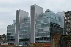ITN has been based at 200 Gray's Inn Road since 1991. The purpose-built headquarters were designed by architect Sir Norman Foster, and officially opened by Queen Elizabeth II on 8 May 1991.[52][53] The building also houses the ITV Network Centre and Warner Bros. offices.[54][55] Prior to the redevelopment, the site was the location of The Times and The Sunday Times offices from 1974 to 1986,[56][57] and The Guardian offices from 1961 to 1976.[58]