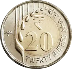 The Indian 20-rupee coin (₹20) is a denomination of the Indian rupee. The ₹20 coin is the highest-denomination circulation coin minted in India since its introduction in 2019. The present ₹20 coin is released for circulation. The release of the coin was supposed to be in March 2020, but it was shifted to May 2020 because of the COVID-19 lockdown. This is used alongside the 20 rupee banknote.[1][2] This coin was released in May 2020 along with the new series of the rupee coins.