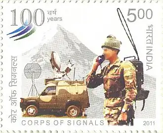 Indian Army Corps of Signals is a corps and a combat support arm of the Indian Army, which handles its military communications. It was formed on 15 February 1911 as a separate entity under Lieutenant Colonel S H Powell and went on to make important contributions to World War I and World War II.[1] The corps celebrated its 100th anniversary of raising on 15 February 2010.[2]