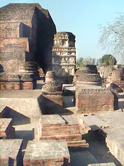 There is an ongoing debate as to the exact geographic origins of Mahayana Buddhism ranging from the Gangetic plains or among small monastic communities on the fringes of the subcontinent in the South and the North East.[32] The number of monasteries that supported Mahayana Buddhism gradually started to increase. In the Gangetic plains, Nalanda mahavihara emerged and gradually became a centre of Mahayana Buddhism receiving patronisation not just from Indian rulers but also from foreign monarchs and monks.[33] Within Nalanda, numerous scholars of note have been associated with it including Shantideva, Aryadeva, Dharmakirti and Chandrakirti.[34]