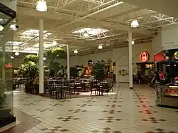 Indian Mound Mall opened its doors on October 23, 1986, becoming the second[2] indoor shopping mall in Licking County. The mall's first logo consisted of a circle with lines, and a feather that represents the native American Indian, which has "Indian Mound Mall" written on it. The original anchor stores consisted of the following: Elder-Beerman, JCPenney, Lazarus, and Hills. Crown Cinema was added to the rear of the mall in 1988.[3] A fountain was originally located in the center of the mall from 1986 to 1997. The same year the fountain was removed, the mall added Sears to replace a freestanding store nearby, and the Crown Theaters expanded from six screens to eleven screens, which became a Hollywood Theater. In 2016, AMC Theatres bought the Hollywood Theater.[4] In 1998, Elder-Beerman was expanded, and later closed on August 26, 2018, adding 20,000 square feet (1,900 m2).[5]