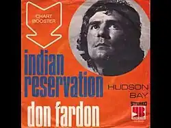 "Indian Reservation (The Lament of the Cherokee Reservation Indian)" is a song written by John D. Loudermilk.[2] It was first recorded by Marvin Rainwater in 1959 and released on MGM as "The Pale Faced Indian", but that release went unnoticed. The first hit version was a 1968 recording by Don Fardon – a former member of the Sorrows – that reached number 20 on the Hot 100 in 1968[3] and number 3 on the UK Singles Chart in 1970.[4]