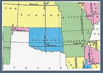 ![]() U.S. Bureau of Land Management map showing the principal meridians in Oklahoma. | |