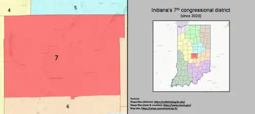 As of 2023, Indiana's 7th congressional district is located entirely in Marion County, covering the capital Indianapolis, except for the southernmost townships of the county.