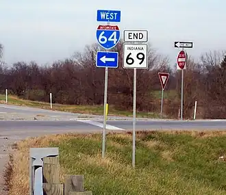 After the track, the roadway turns due west and has a sharp turn back due north, north of Mount Vernon. The highway heads north-northwest towards New Harmony as a rural two-lane highway, passing through mainly farmland with some woodlands. The route passes east of the Harmonie State Park and bypasses New Harmony to the southeast. SR 69 begins a concurrency with SR 66, heading northeast. Soon after the concurrency begin it ends with SR 66 heading due east and SR 69 still heading northeast. At an intersection with the western terminus of SR 68, SR 69 heads due north, before turning northwest. The highway makes a sharp curve heading northeast towards Griffin where it terminates at Interstate 64 (I–64).[4][6]